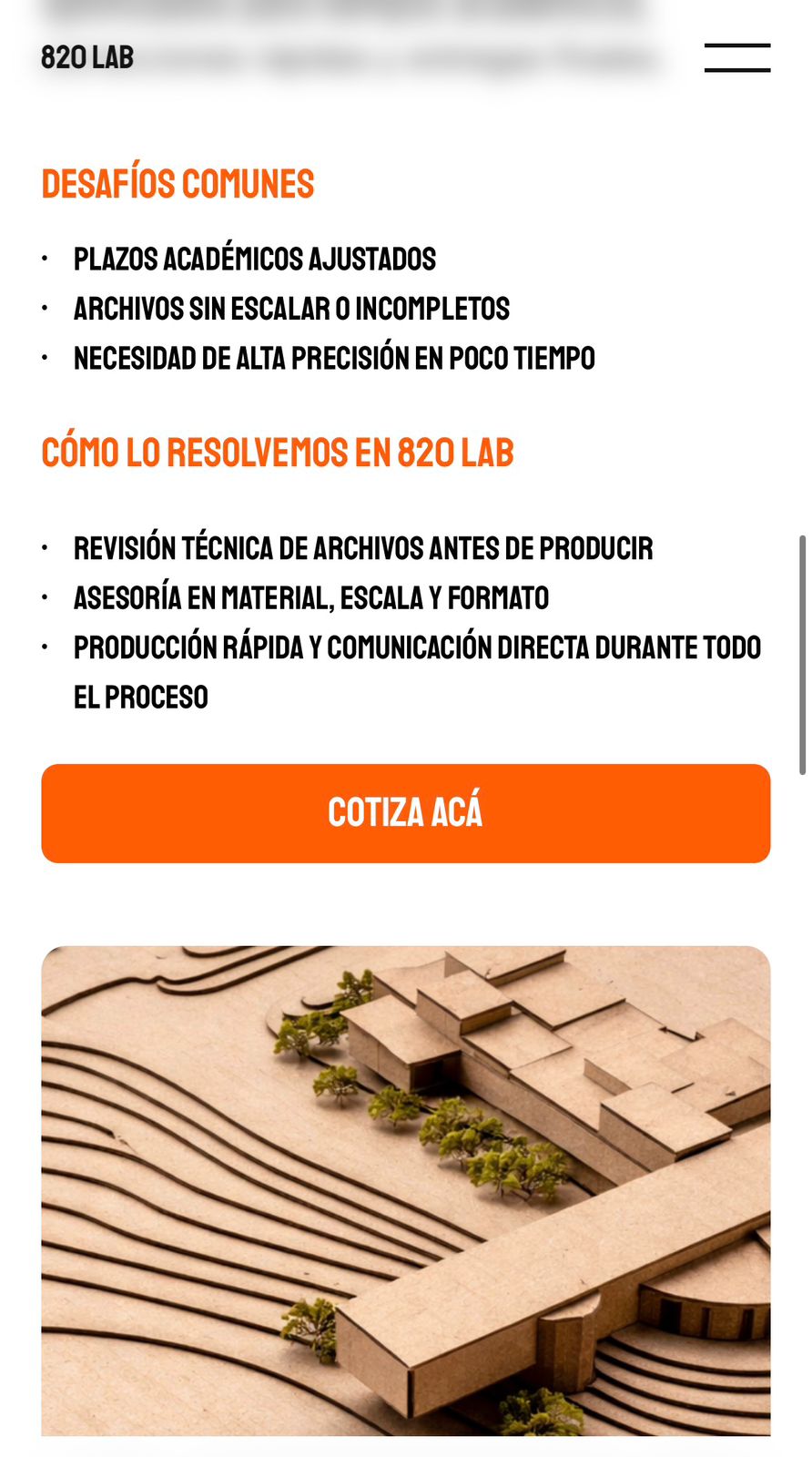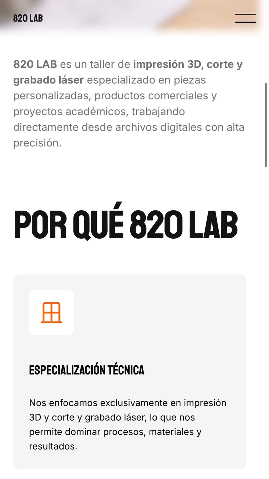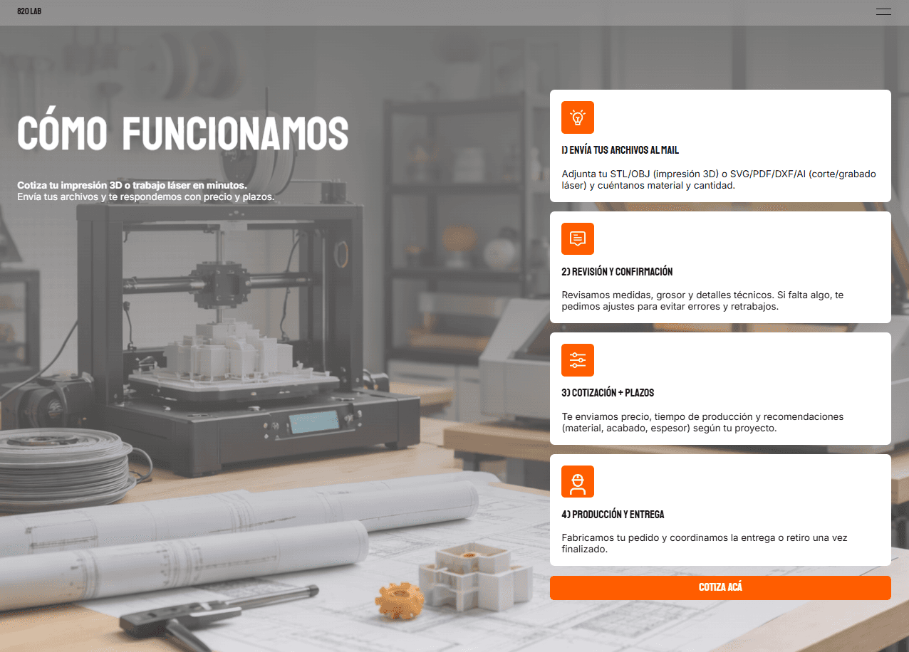 El resultado fue un sitio web claro, visual y estratégicamente estructurado, que logra comunicar de manera efectiva los servicios de fabricación digital de 820 Lab. La nueva arquitectura de información y la simplificación de contenidos permiten que los usuarios comprendan rápidamente procesos como la impresión 3D y el corte láser, reduciendo la complejidad técnica y facilitando la toma de decisiones.