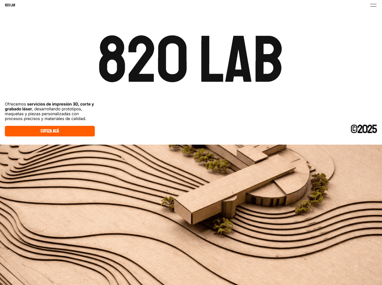 820 Lab necesitaba un sitio web que comunicara de forma clara y atractiva sus servicios de fabricación digital, como impresión 3D y corte láser, dirigido principalmente a estudiantes, diseñadores y creadores.
